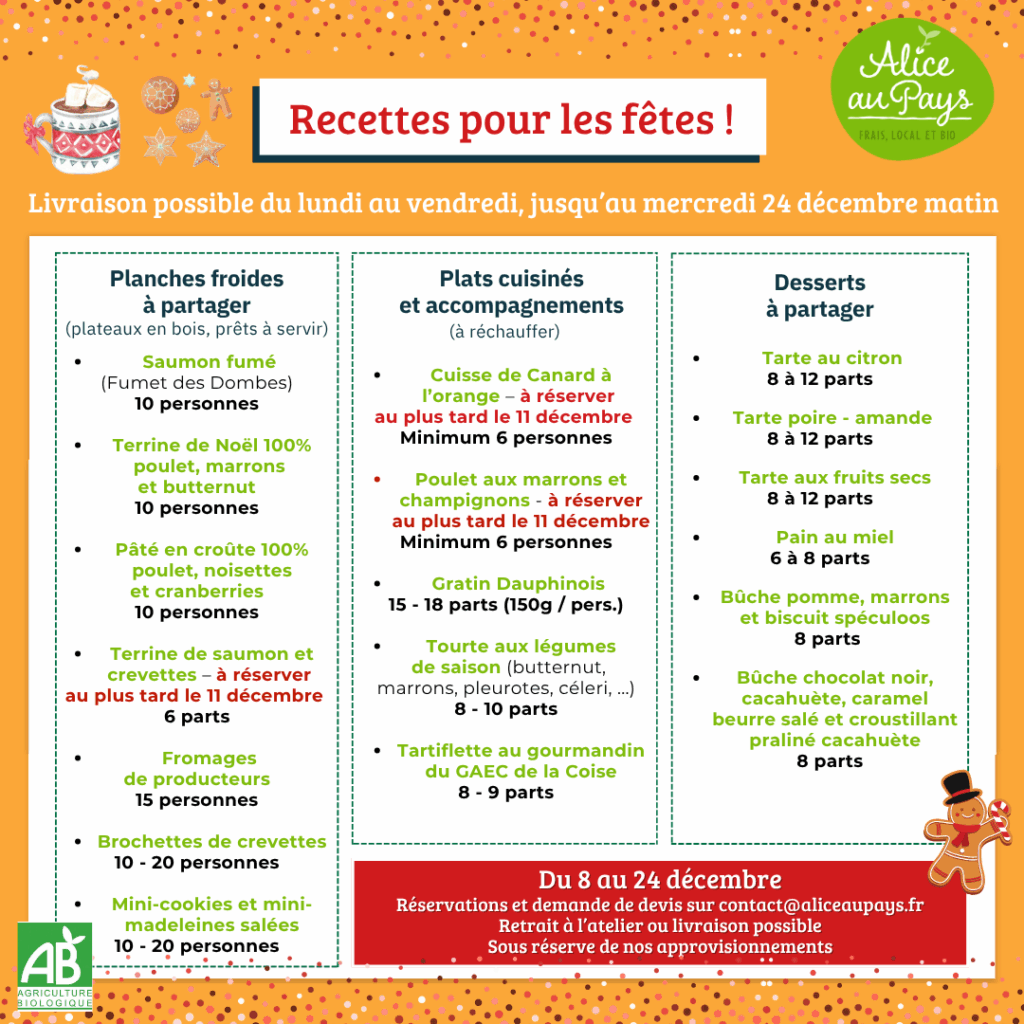 Si vous organisez un repas de fin d’année dans votre entreprise ou association, n’hésitez pas à nous envoyer un mail sur : contact@aliceaupays.fr ! 🌱